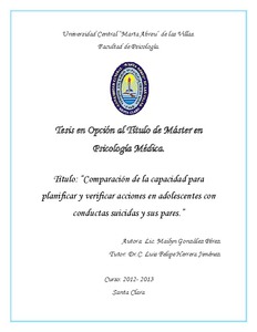 | dc.description.abstract | La presente investigación se realizó con el objetivo de comparar las características neuropsicológicas de la capacidad para planificar y verificar acciones en adolescentes con conductas suicidas y sus pares que no la presentan. Se efectuó un estudio descriptivo - correlacional en el período comprendido entre septiembre del 2011 y diciembre del 2012. La muestra estuvo conformada por 60 adolescentes escolares en el rango de 11 a 18 años de edad divididos en dos grupos, uno de estudio, formado por adolescentes con conductas suicida y uno testigo, formado por sus pares que no portan esta conducta. Para la obtención de información se emplearon las técnicas siguientes: Revisión de Documentos Oficiales, Entrevista psicológica a los adolescentes, Cuestionario de aislamiento y soledad, STAXI II, Simultaneidad de signos, Cubos de Kosh, Test Gestáltico Visomotor de L. Bender, subtest de la Batería de Evaluación Neuropsicológica de A. R. Luria y el WSBI. Los resultados obtenidos fueron valorados cualitativa y cuantitativamente; para el análisis estadístico matemático se empleó la técnica U de Mann Whitney contenida en el paquete SPSS versión 20. En el grupo estudio se constataron insuficiencias en la expresión de los sistemas funcionales relacionados con la flexibilidad del pensamiento y el establecimiento de alternativas en la solución de problemas, en la capacidad para la planificación y verificación de la acción que tiene su base neuropsicológica en las estructuras corticales de la áreas prefrontales. En cuanto al control emocional predominó la inestabilidad con tendencia a experimentar ira, y sentimientos de aislamiento y soledad. En la situación social de desarrollo fue significativa la influencia del medio familiar y el escolar. | en_US |